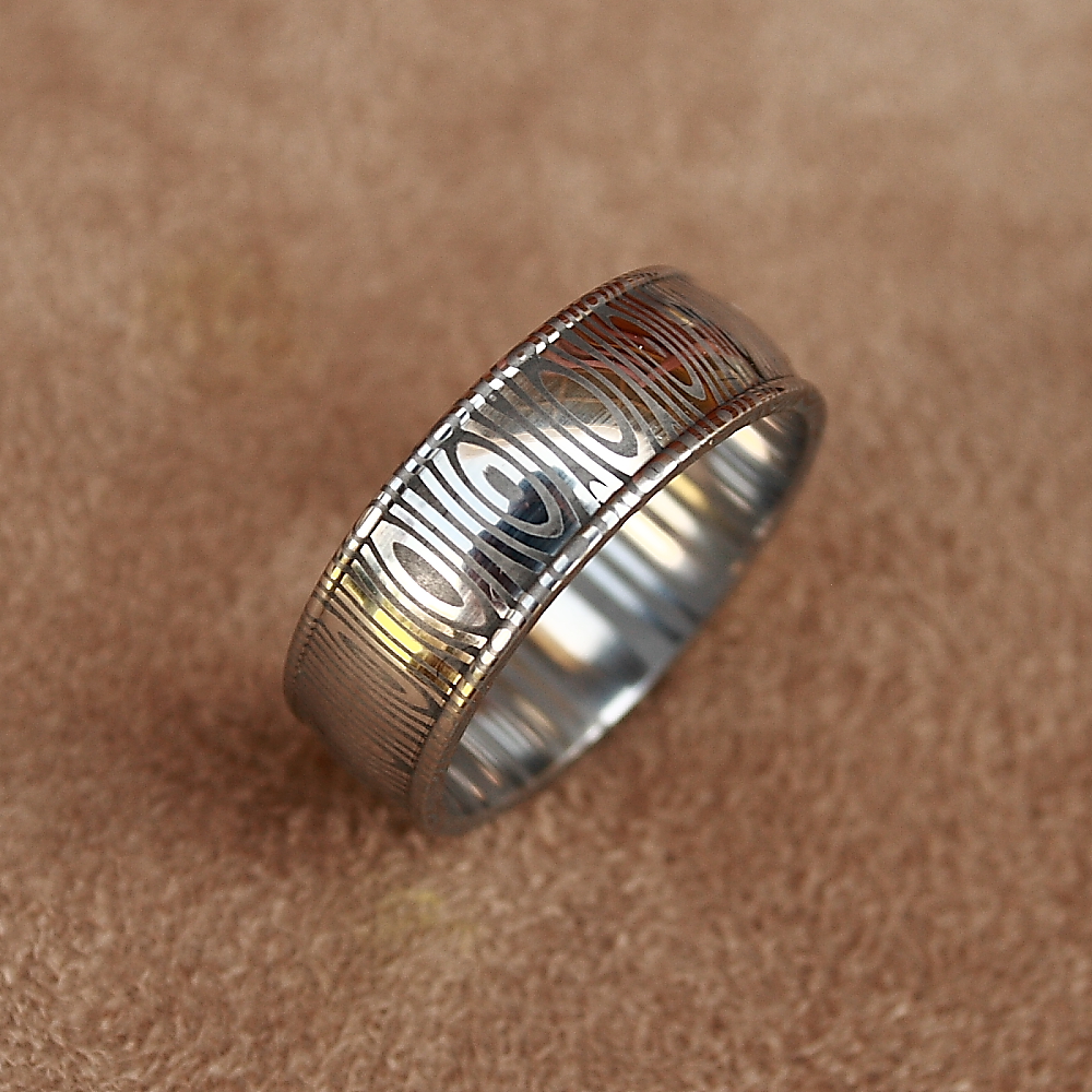 Rings are made to order to perfect fit size, because machined from solid bars are not resizable. They range from 4 to 10 mm in width, stone setting is available with hand engraving or plain finishes.